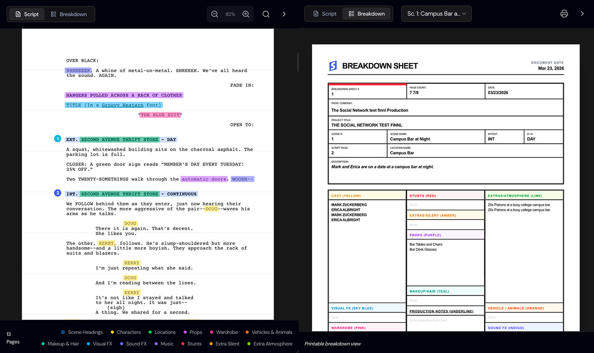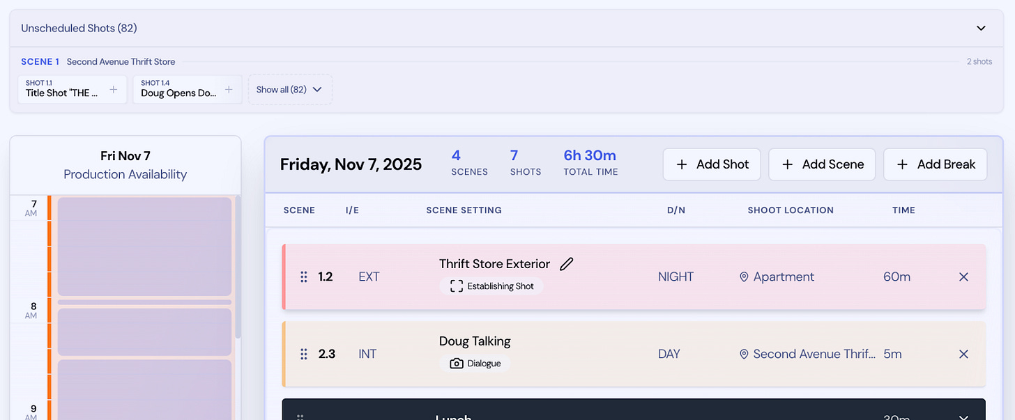 It takes a script and turns it into the foundation of a shoot plan. It breaks down scenes, identifies characters, props, and locations, and helps generate a workable schedule around real production constraints like cast availability and location access.
